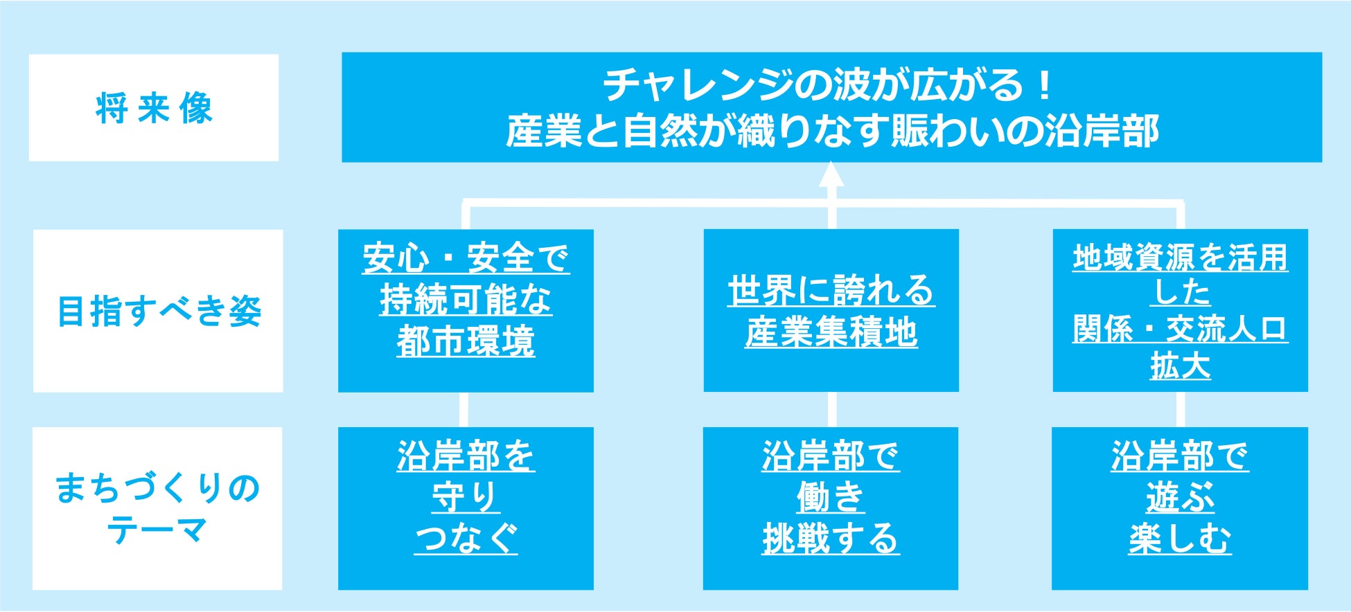 沿岸部のまちづくりの方向性として3つのテーマを掲げ、将来像に向けた取り組みを進めます。