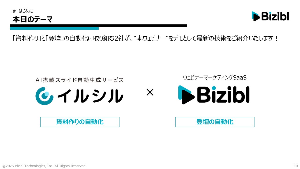 AI搭載スライド自動生成サービス「イルシル」を提供する株式会社イルシル(本社:東京都新宿区、代表取締役:宮﨑 有貴)は、ウェビナーマーケティングツール「Bizibl(ビジブル)」を提供する株式会社Bizibl Technologies(本社:東京都千代田区、代表取締役:花谷 燿平)と共催で、「ALL AIウェビナー!ウェビナーの資料作成・登壇をAIで全自動化」と題した無料ウェビナーを2026年2月10日(火)〜2月12日(木)に開催いたします。
