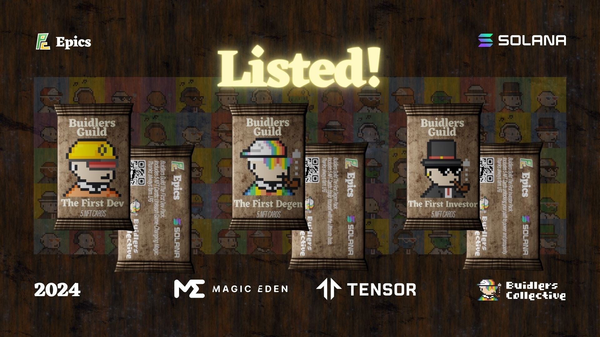 現在 Buidlers Guild Alpha のカードパックは、Epics プラットフォーム上で入手可能な他、Magic Eden と Tensor にて取引が可能になっております。ぜひこの機会にお手に取ってみてください。