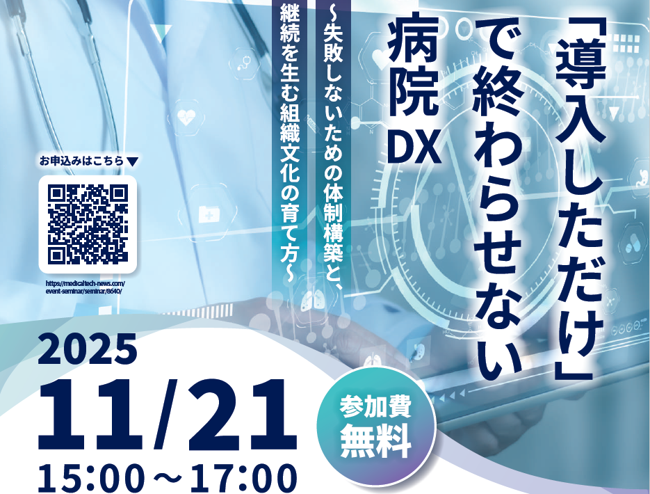 株式会社シード・プランニング(本社:東京都文京区、代表取締役社長:梅田 佳夫)が運営する[医療のデジタル化に取り組む人のための情報サイト|医療テックニュース(https://medicaltech-news.com/)]が、2025年11月21日(金)に【「導入しただけ」で終わらせない病院DX~失敗しないための体制構築と継続を生む組織文化の育て方~】と題したセミナーを開催します。