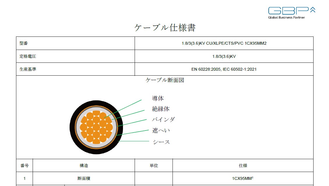 こうした現場の声を受け、GBPではIEC 60502-1に準拠した構造をベースに、国内の電気設備技術基準に準拠する「銅テープ遮へい層」を加えたハイブリッド仕様の接続用ケーブル(蓄電システム専用ケーブル)を開発。