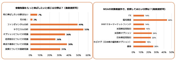 新NISA枠外で投資してみたい分野、金融リテラシーを伸ばしたい分野については、テクニカル分析(55%)が最も高く、ファンダメンタルズ分析(49%)、株式や債券の知識(取引方法や商品知識)(38%)と続きました。投資してみたい分野としては、暗号資産(44%)が最も高い結果となりました。