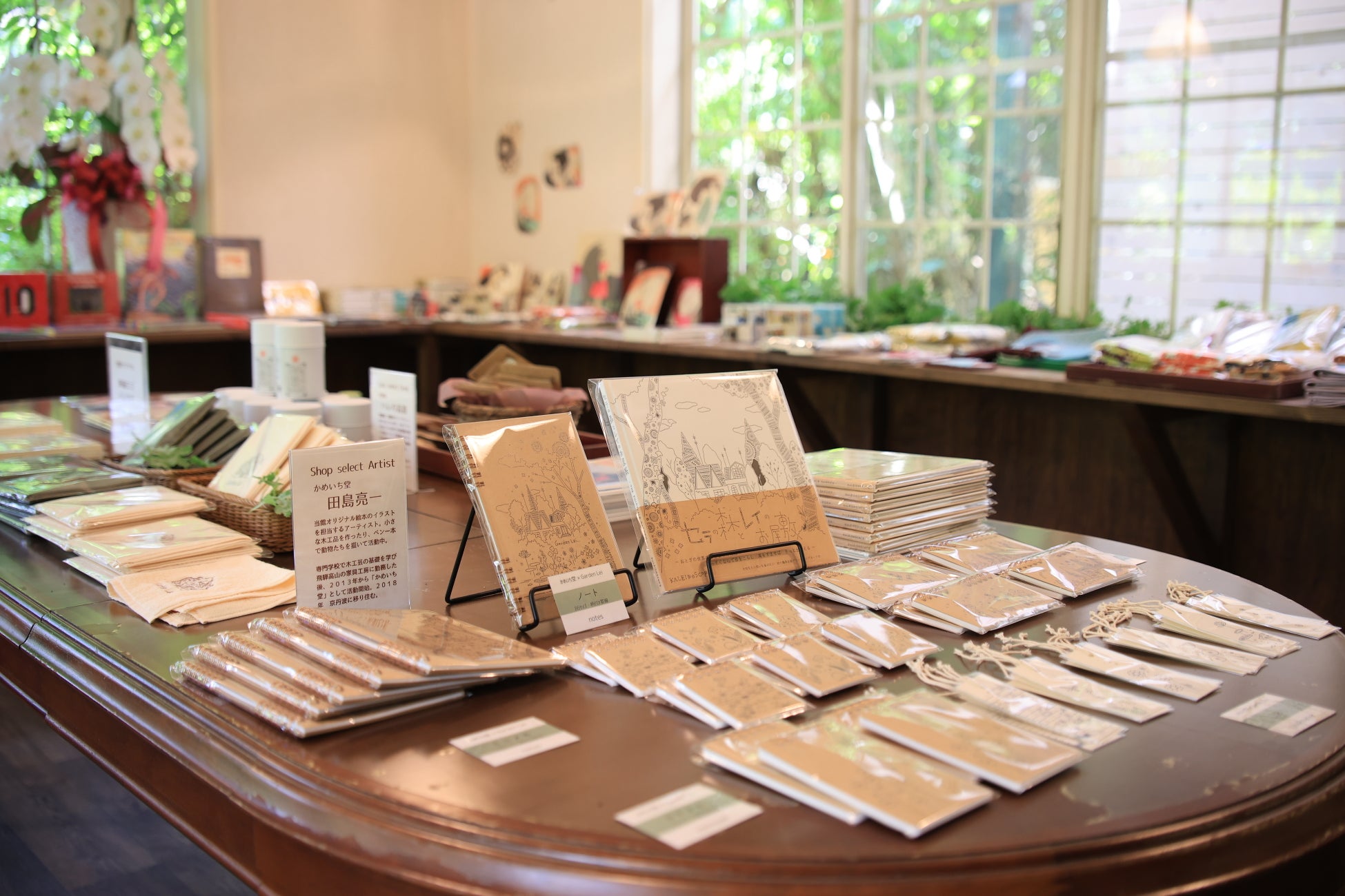 当館オリジナル絵本「セラの森とレイのお屋敷」や、イラスト雑貨、当館がセレクトしたアーティストの雑貨、花にまつわるアイテムなどをそろえています。