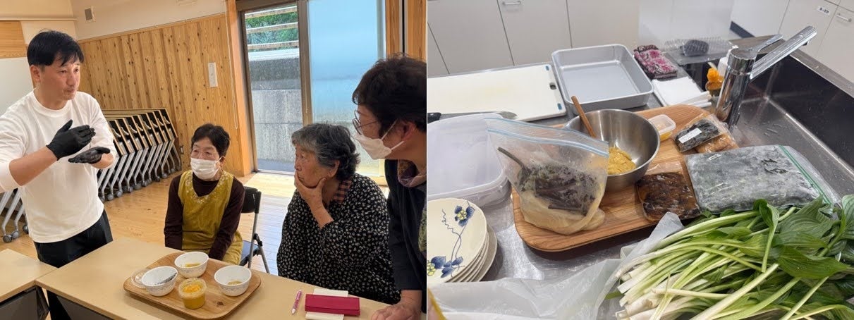 江口シェフとZESDAメンバーは、馬路村女性部の皆さんと意見交換を行い、村内で採れるギボウシやリュウキュウといった山菜の扱い方を教わったほか、天然の鮎やウド、イタドリといった食材を日常的に取り入れる食文化に触れました。都市部では「非日常」となるこれらの食材が、馬路村では「当たり前」の風景の中にあることに、一同深い感銘を受けました。このほかに、ゆずを活かした調理法や日常的な保存・加工の工夫についてもお話を伺い、普段の暮らしに根ざした知恵と感性が息づいていることを実感しました。また、江口シェフからは、持ち込んだ食材で考案したゆず料理を女性部の皆さまに試食していただき、新たなゆず料理の可能性を探りました。