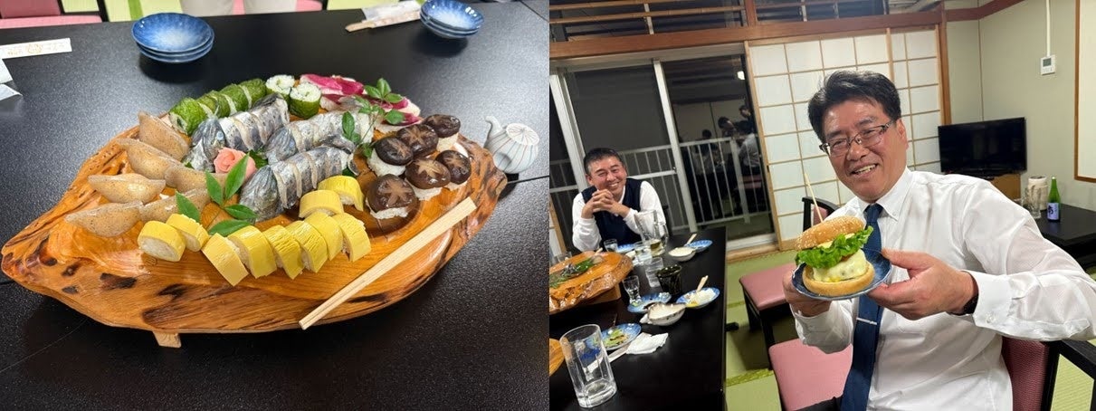 さらに、夜の会食では、馬路村温泉の料理長による「田舎寿司」や、江口シェフが考案したゆずの皮やゆず調味料を使用した「ゆずバーガー」などを関係者で試食し、馬路村の豊かな食文化を象徴する味に舌鼓を打ちました。調味料や保存食として巧みに使われる“ゆず”の多彩な活用法にも、新たな可能性が見えてきました。