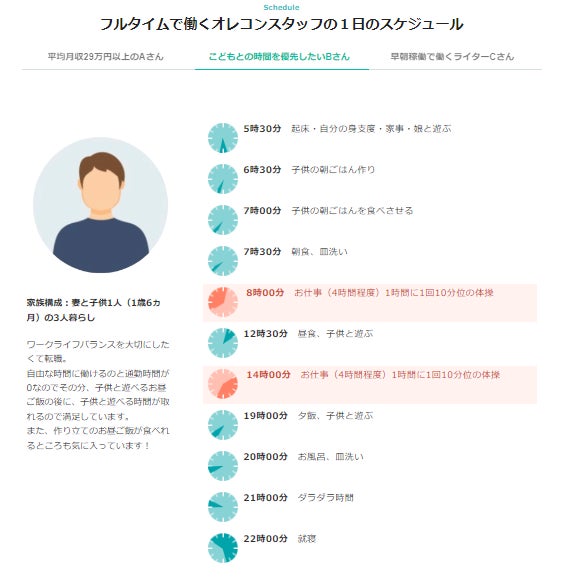 オレコンは、フルリモート・フルフレックスの勤務体制を採用しています。新しいLPでは、オフィスに縛られない自由な働き方を強調し、いつでも自分や家族を優先できる環境を提供していることをアピールしています。