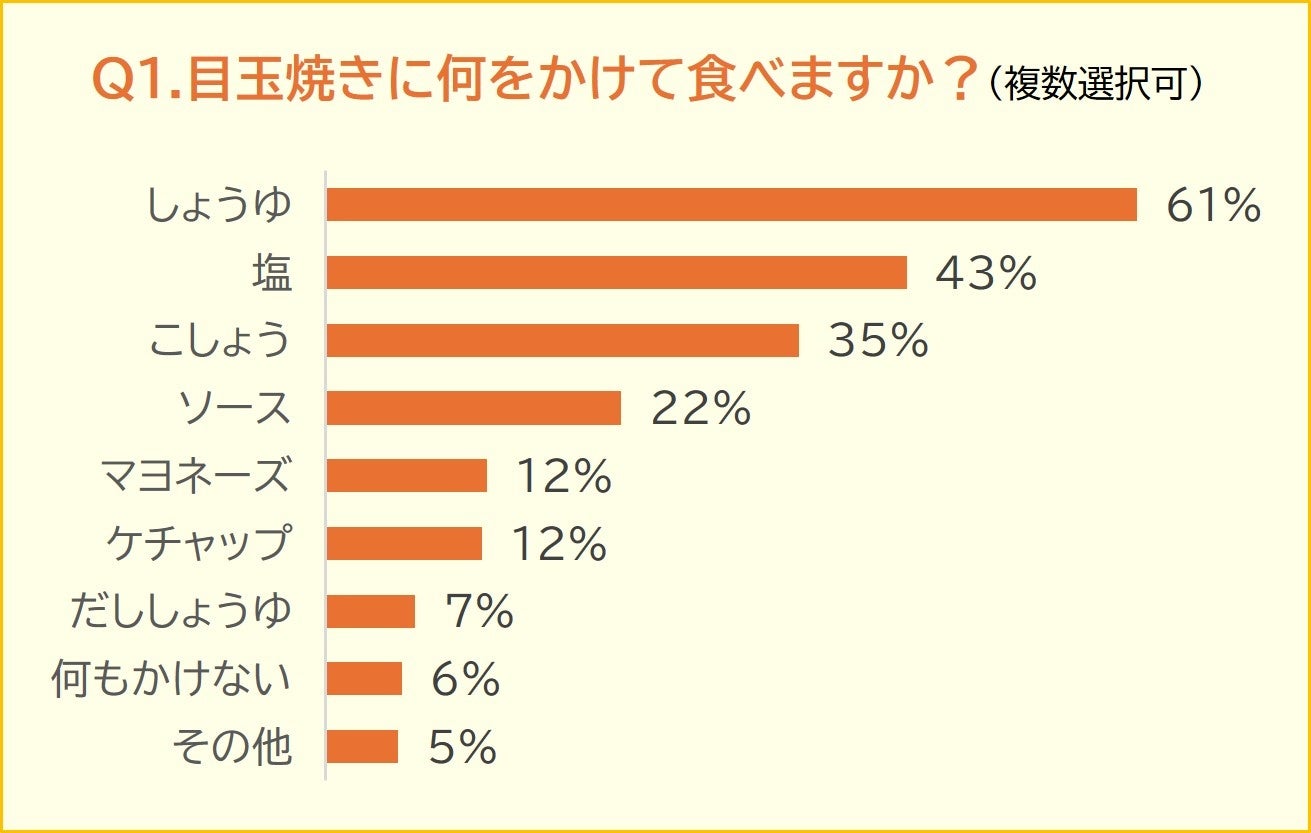 目玉焼きにかける調味料(複数回答)は、しょうゆ:61%、塩:43%、こしょう:35%、ソース:22%の順で、何もかけないと回答した人は6%でした。
