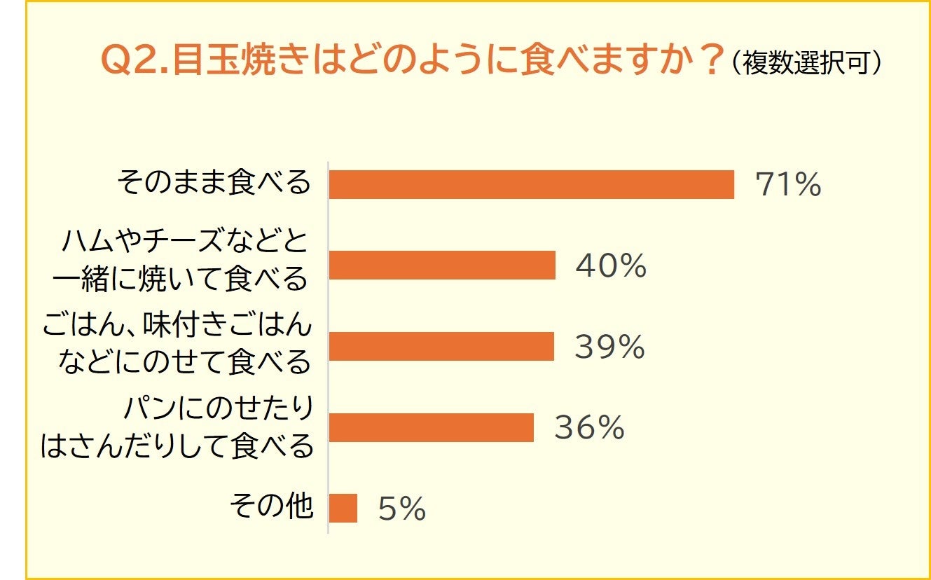 そのまま食べると回答した人が約70%でしたが、ハムやチーズと一緒に焼いて食べる、ごはんやパンにのせるという人も約40%でした。家にある材料や気分によって、さまざまな食べ方で目玉焼きのアレンジを楽しんでいるのがわかります。