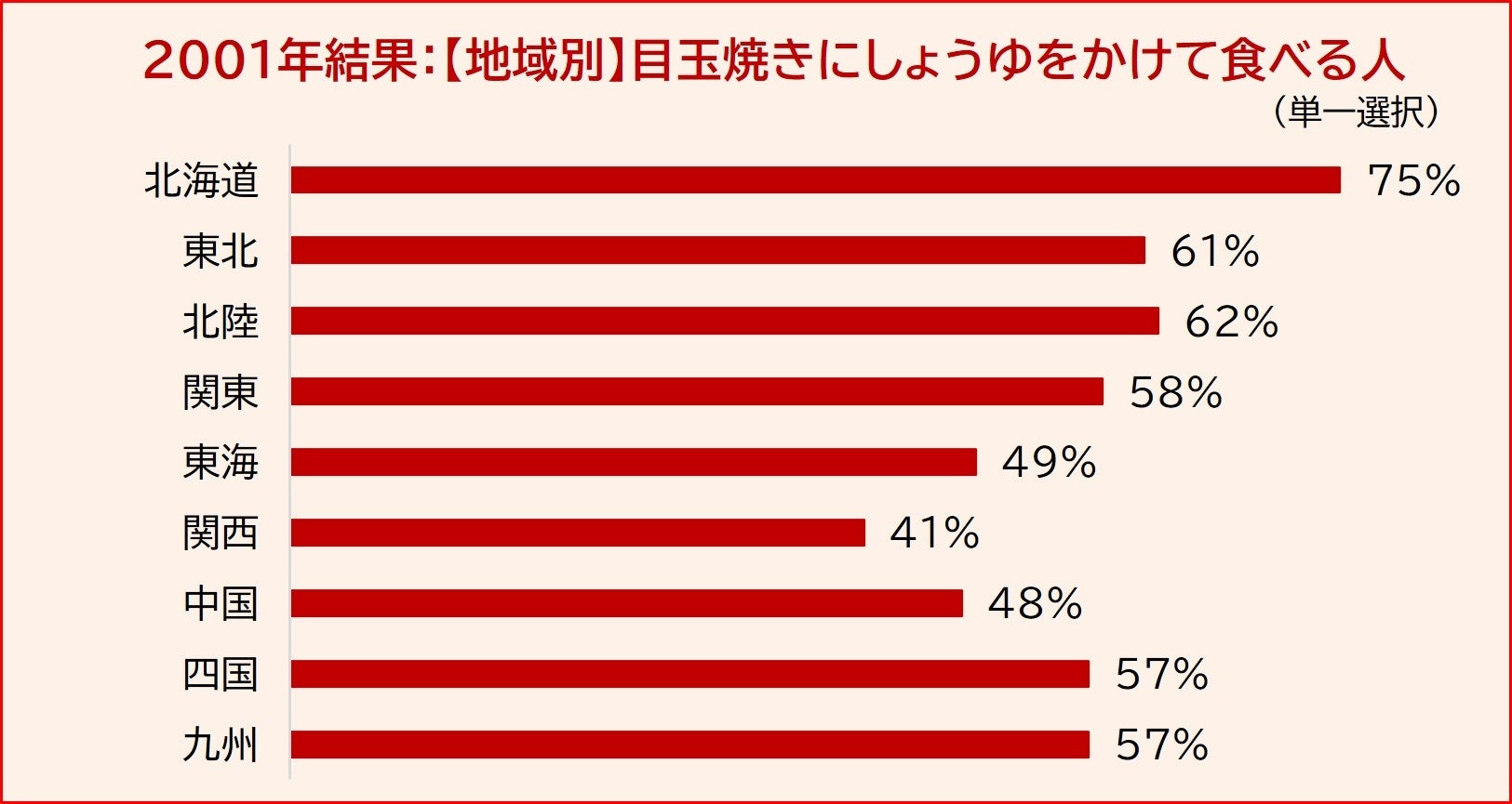 地域別にみると、目玉焼きにしょうゆをかけると回答した人の割合は、北海道と東北地方では70%を超えました。関西地方の割合が最も低く、この傾向は、2001年に当社が実施した調査(*3)と同様でした。