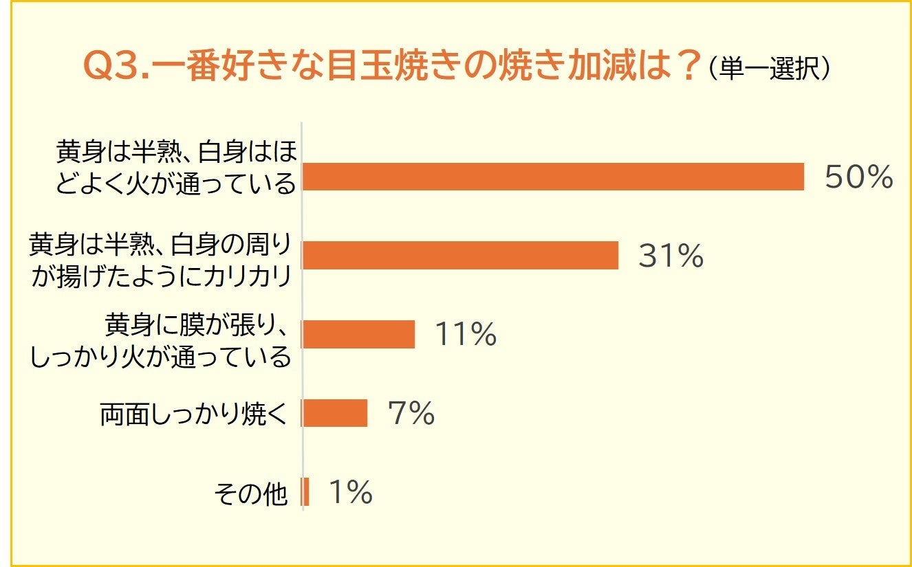 「黄身は半熟派」が約80%と根強い人気がある一方、白身は、「ほどよく火が通っている派」と「周りが揚げたようにカリカリ派」に分かれました。