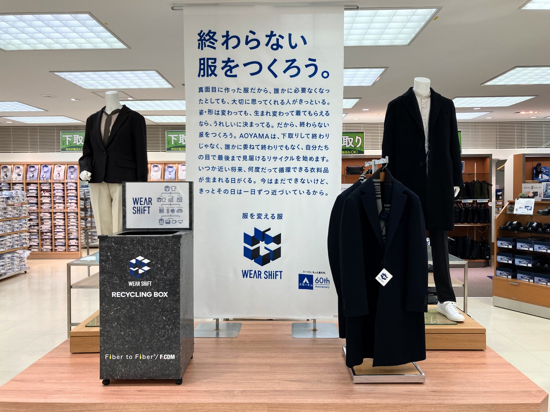 当社は、1998年から「下取りサービス」として店頭で不要になったスーツやドレスシャツ・レディスアイテムなどの回収を進めてきました。それに加え、昨今のSDGsへの取り組み意識の高まりに合わせて、お客様がより気軽にエコ活動に参加できる回収方法として、2023年10月より「洋服の青山」に加え「スーツスクエア」「ザ・スーツカンパニー」含めた全国726店舗(2023年9月末時点)でリサイクリングBOX「WEAR SHiFT(ウエアシフト)」を設置しています。また、さらなる環境負荷軽減を目指し、衣類が循環できる仕組みの実現に向けた想いをロゴと宣言コピー「終わらない服をつくろう。」に込め、取り組みを推進していきます。
