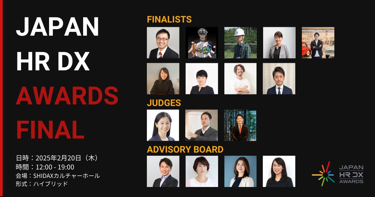 JAPAN HR DX AWARDS実行委員会(事務局:一般社団法人日本デジタルトランスフォーメーション推進協会)は、2025年2月20日(木)に開催される「JAPAN HR DX AWARDS FINAL」に向けて、全ファイナリストを発表しました。今年度は28件の応募があり、その中から厳正な審査を経て選ばれた9件の取り組みが最終選考に進出しました