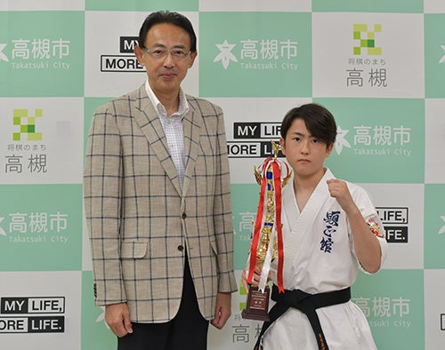 高槻市立第七中学校3年生の勇山琉陽さんが30日、高槻市役所を訪問し、今年4月2日に東京都小金井市で開催されたPOINT&K.O.第37回全日本空手道選手権大会中学男子軽量級の部に出場し、優勝したことを濱田剛史市長へ報告しました。