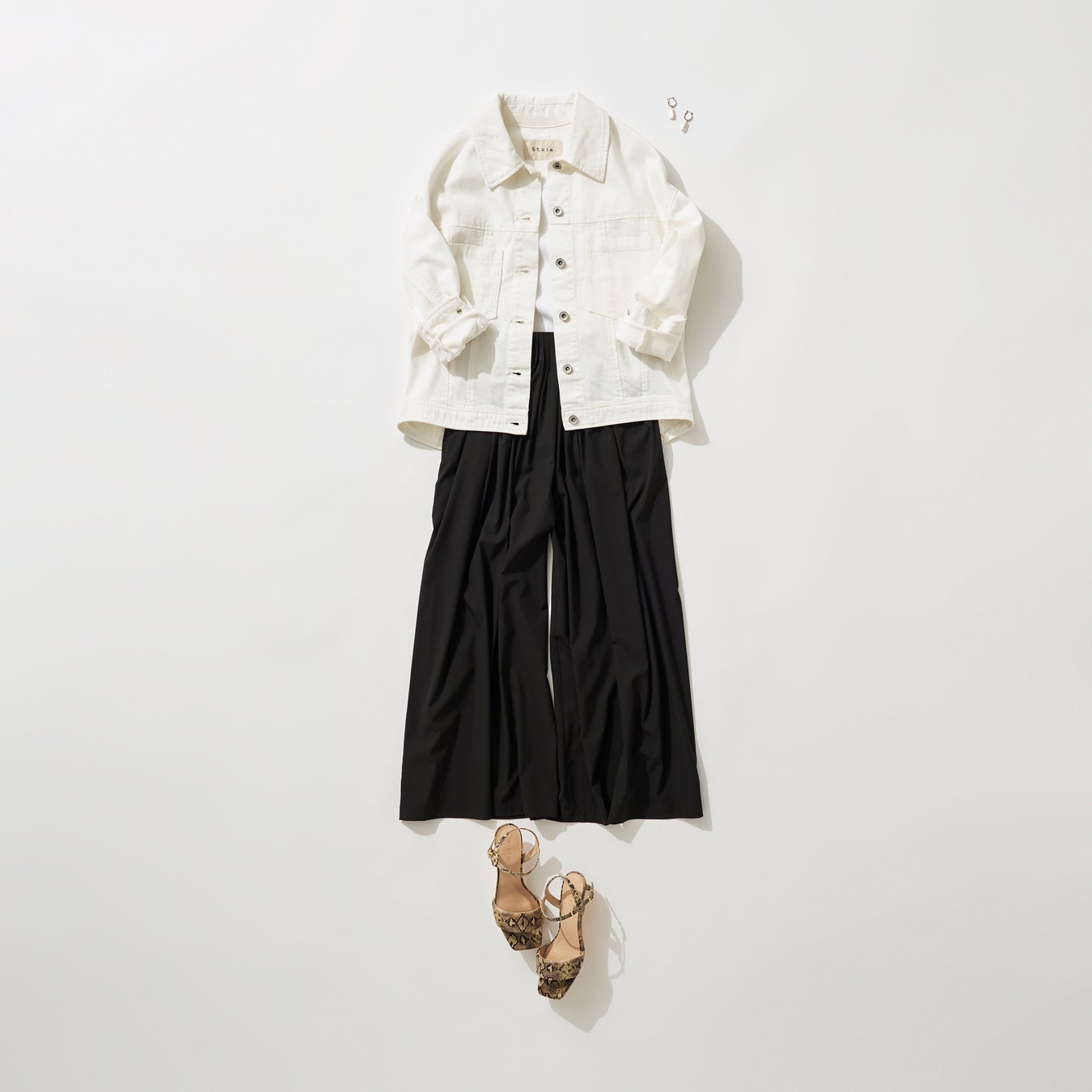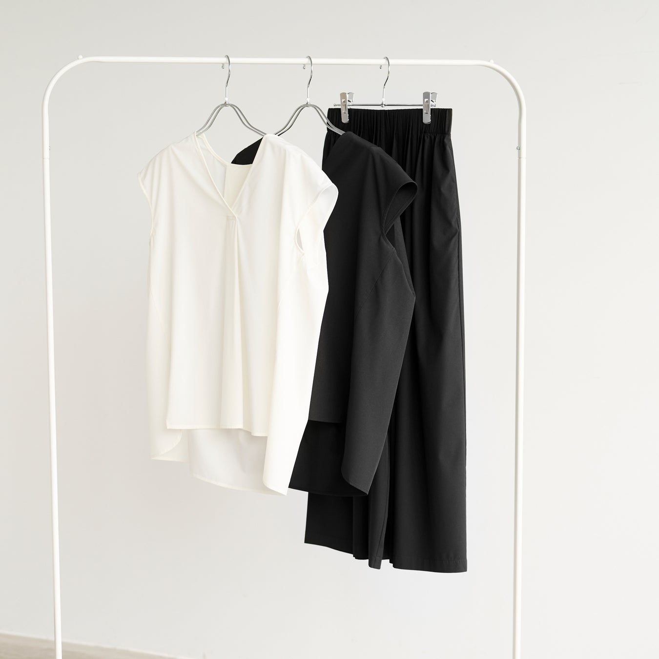 バックのタックディテールが特徴のブラウスと、つまみ出しタックで生地を浮かせたワイドパンツのセットアップ。ゆったりと肌から離れるシルエットで通気性も良く、暑い日も快適な着心地です。