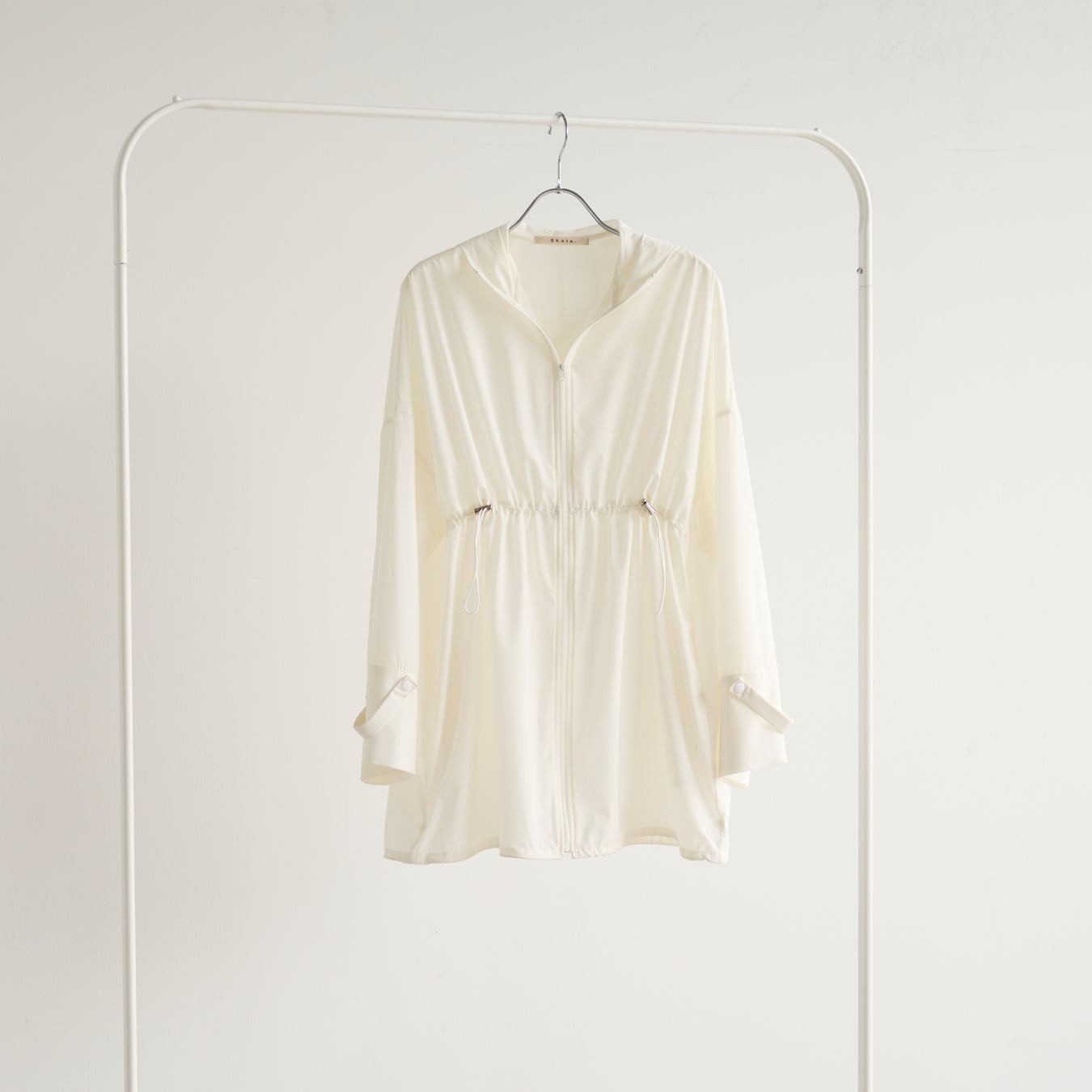 ポリウレタンを15%含むストレッチ性の高いポリエステル生地に、撥水・UVカット機能を搭載しています。ソフトでさらりとした風合いと、まるで着ていないかのような“薄軽”な着用感。洗濯機洗いOKで、シワになりにくいのも特徴です。