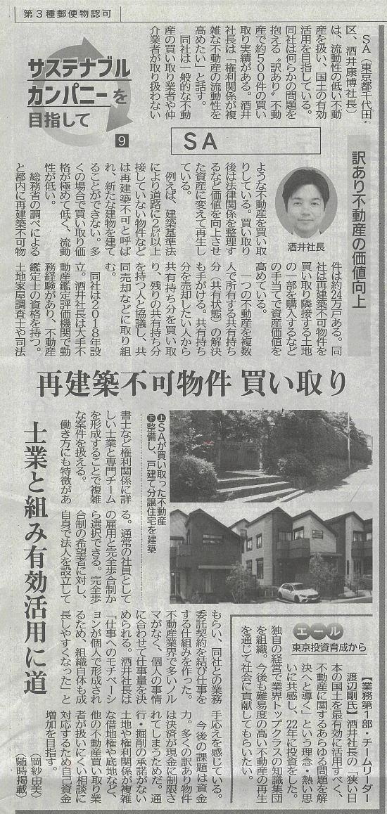 SAグループは、創業以来、不動産の共有持分(共有名義)の解決や空き家の再生、権利関係が複雑な借地権・底地、 接道を満たしていない再建築不可から立退案件まで、流動性の低い不動産を再生し、蘇らせる流動化事業を展開。年間5,000件の相談実績、1,000件の売買実績を誇り、国土交通省から登録講習期間に指定され、宅建願書にも記載されている不動産会社です。三大国家資格の一つで不動産最高峰の資格、不動産鑑定士を保有する当社代表を始めとした訳アリ不動産専門チームで24時間365日対応します。また、株式会社SAでは、不動産に関する多様な事業領域が評価され、東京中小企業投資育成株式会社(公的機関)が安定株主として、SAの株式の一部を長期保有しており、金融機関からの高い信頼を獲得しています。