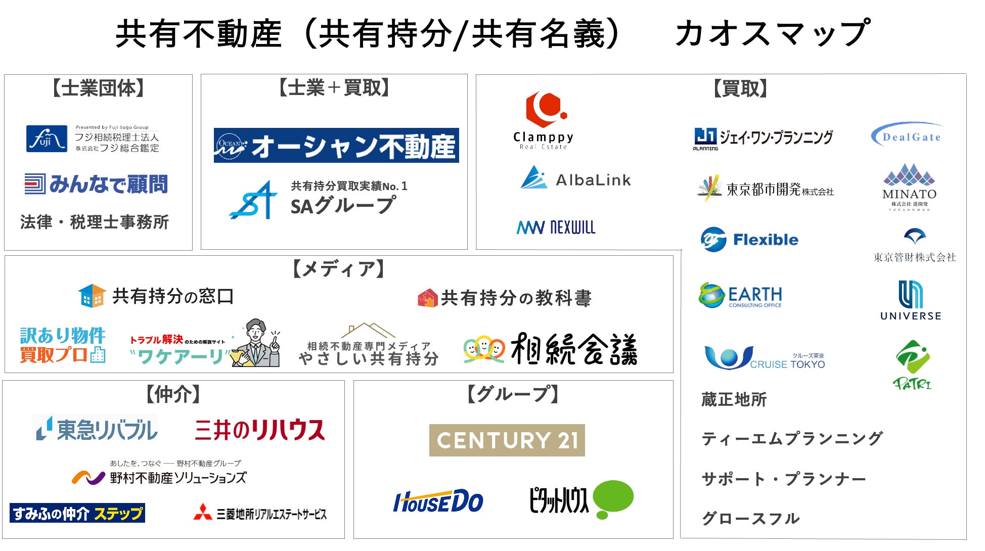 株式会社SA(代表取締役:酒井 康博 東京都千代田区紀尾井町3-12 紀尾井町ビル6階)は、「共有不動産」分野での市場機会を明らかにするため、共有不動産の専門チームの実績、考察を基に、網羅的・多面的に国内で初めて共有不動産に関する各種企業、団体の市場を網羅的に分析した「共有不動産(共有持分/共有名義) カオスマップ」を作成しました。