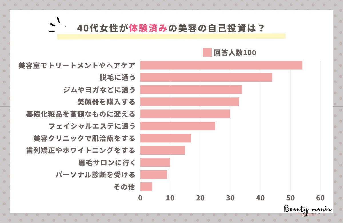 40代女性では色々とすでに経験済みのことも多く、その上でこれから美容の自己投資の何をしたいのかが回答されているのでぜひ年代の近い人は参考にしてみてください。