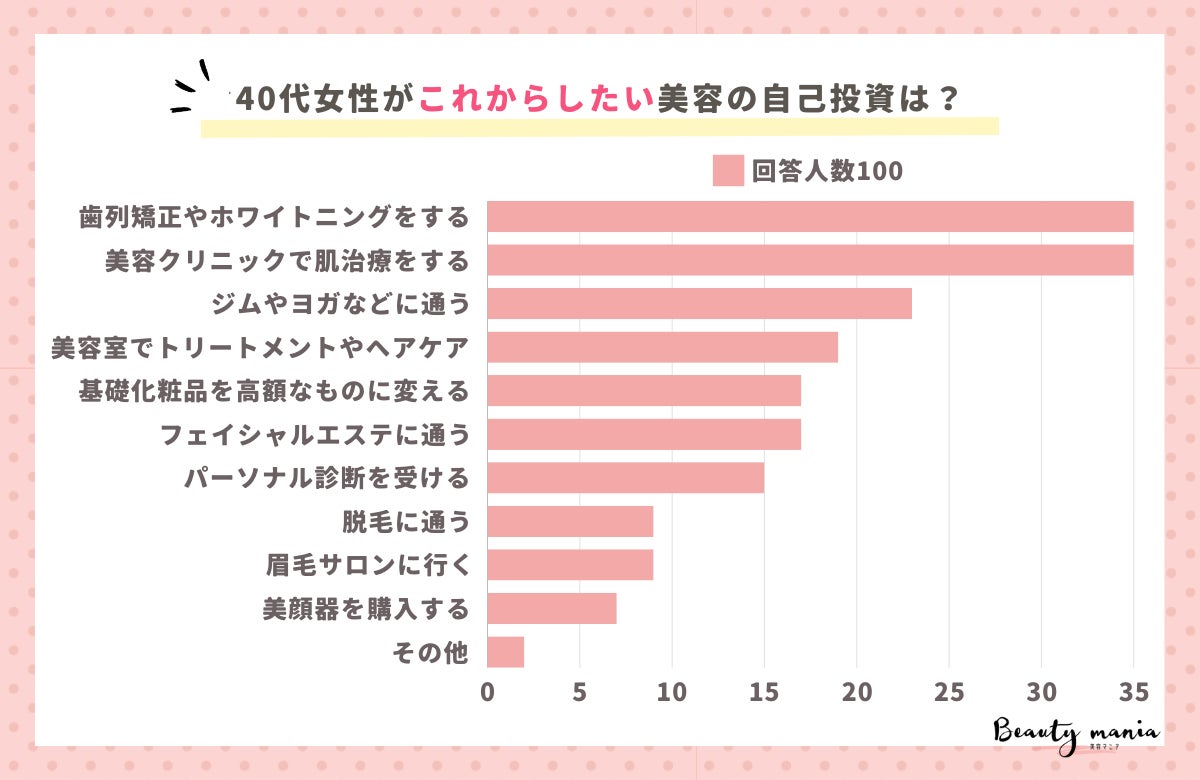 「40代女性の美容の自己投資でこれからしたいことはなんですか?」というテーマで100人にアンケートを行ったところ、同率1位だった『クリニックで肌治療をする』『歯列矯正やホワイトニングをする』と回答したのは全体の35%でした。