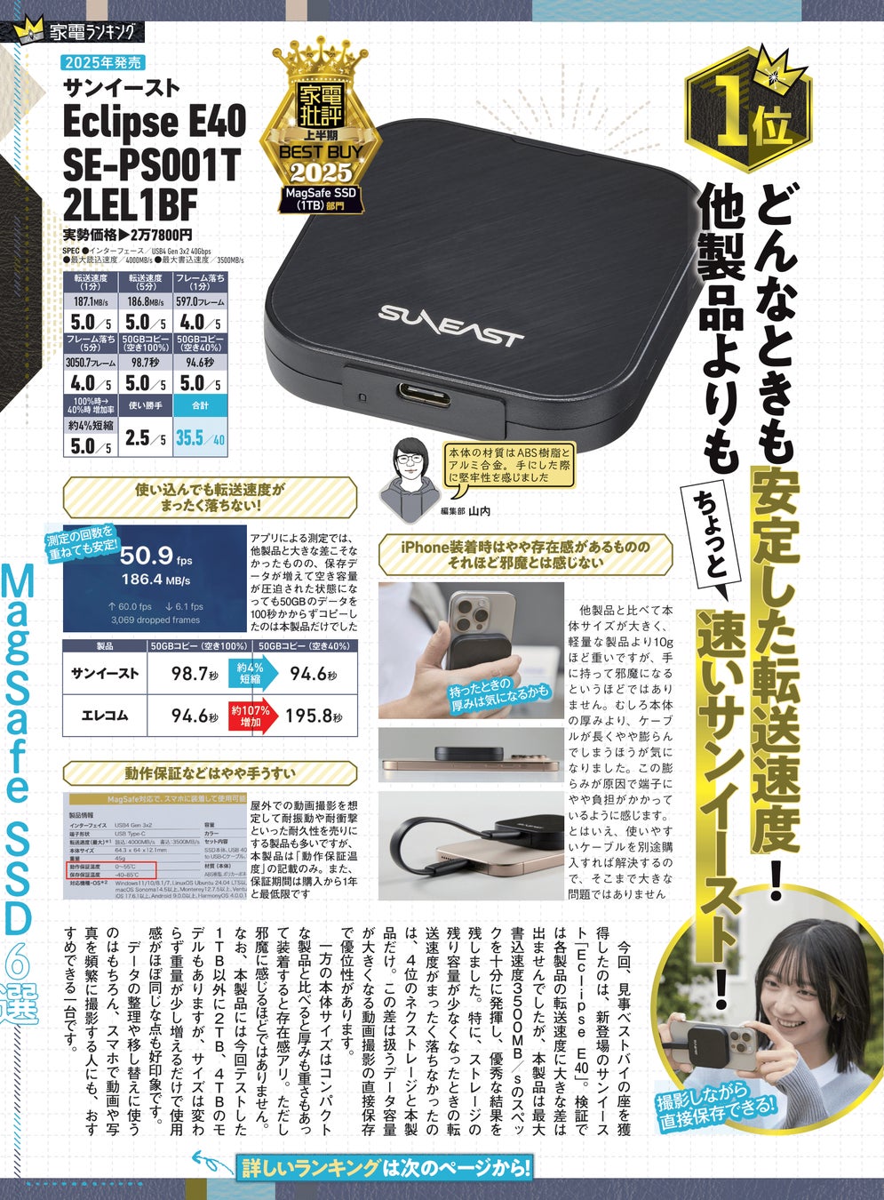 今回、SUNEAST「Eclipse E40」は他メーカーを抑え、MagSafe SSD(1TB)部門において2025上半期ベストバイを獲得いたしました。