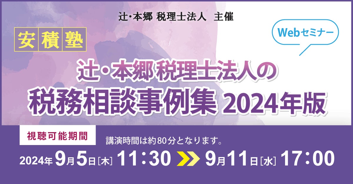 辻・本郷 税理士法人(本社:東京都新宿区、理事長:徳田孝司)は、2024年9月5日(木)より「【安積塾】辻・本郷 税理士法人の税務相談事例集 2024年版」セミナーを開催いたします。辻・本郷では、法に基づいた厳正な税務判断を実現するために、各分野のスペシャリストで構成される審理室を設立しています。本セミナーでは、審理室が現場スタッフより受けた数ある相談の中から、特に気を付けたい事例の紹介や、実務で悩みがちな判断ポイントについて詳しく解説します。