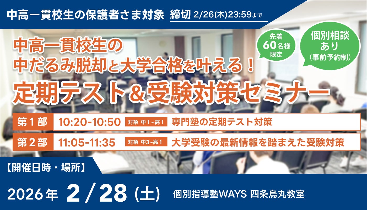 中高一貫校専門 個別指導塾WAYS(運営:株式会社メイツ、本社:東京都新宿区)は、2026年2月28日(土)、四条烏丸教室にて、中高一貫校に通う中学生・高校生の保護者様を対象とした『中高一貫校生の「中だるみ脱却」と「大学合格」を叶える!定期テスト&受験対策セミナー』を開催いたします。