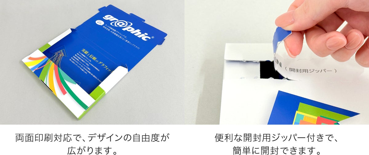 印刷は両面に行うことができるため、ブランドのイメージに合わせたデザインで、こだわりのパッケージをお作りいただけます。また、便利な開封用ジッパーが付いているので、内容物を傷つけることなくスムーズに箱を開封でき、中身を取り出しやすい構造が特長です。