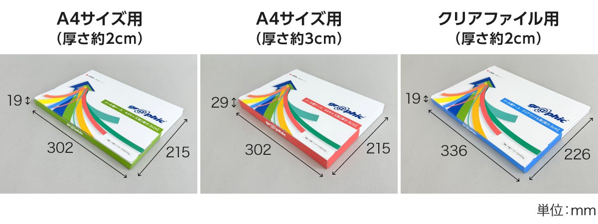 ・A4サイズ用(厚さ3cm):幅302mm×奥行215mm×高さ29mm