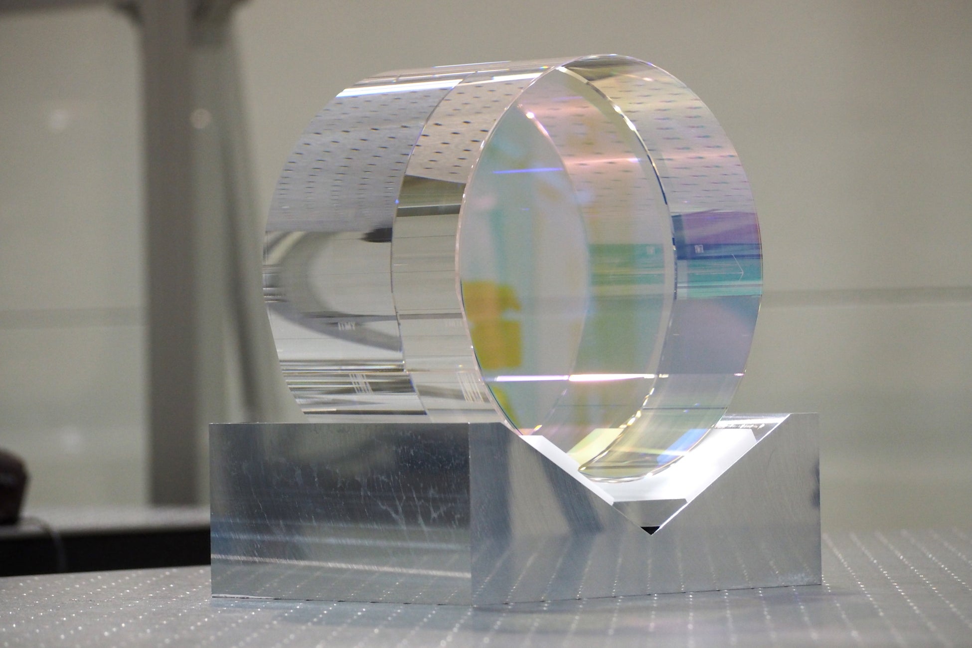 レーザー光線が当たっても温度の上昇を避け、振動を抑えるため、KAGRAの心臓部には、サファイアの鏡が使われています。その貴重な試作品が大阪にやってきます!