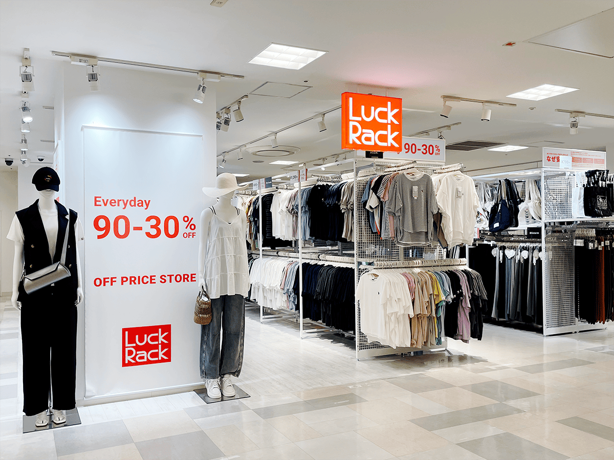 「ラックラック」は、ゲオグループが展開するオフプライスストアです。私たちは、メーカーやブランドの余剰在庫やシーズンを過ぎた商品を買い取り、ブランドの垣根を越えて常時90%~30%オフという魅力的な価格で販売しています。