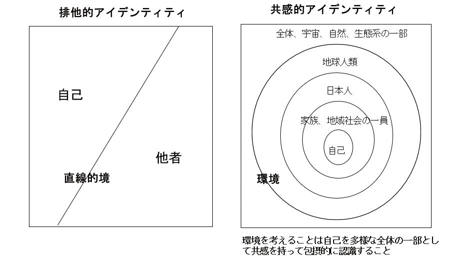環境とは環になった境という意味です。直線によって区分された他者とは交わることはありませんが、環になった境であれば、境の内部は全体の一部です。つまり、自己とは〇〇家の一員であり、〇〇国の国民であり、地球人であり、そしていのちの連鎖の一部なのです。アイデンティティは同心円の様に限りなく広がっていきます。