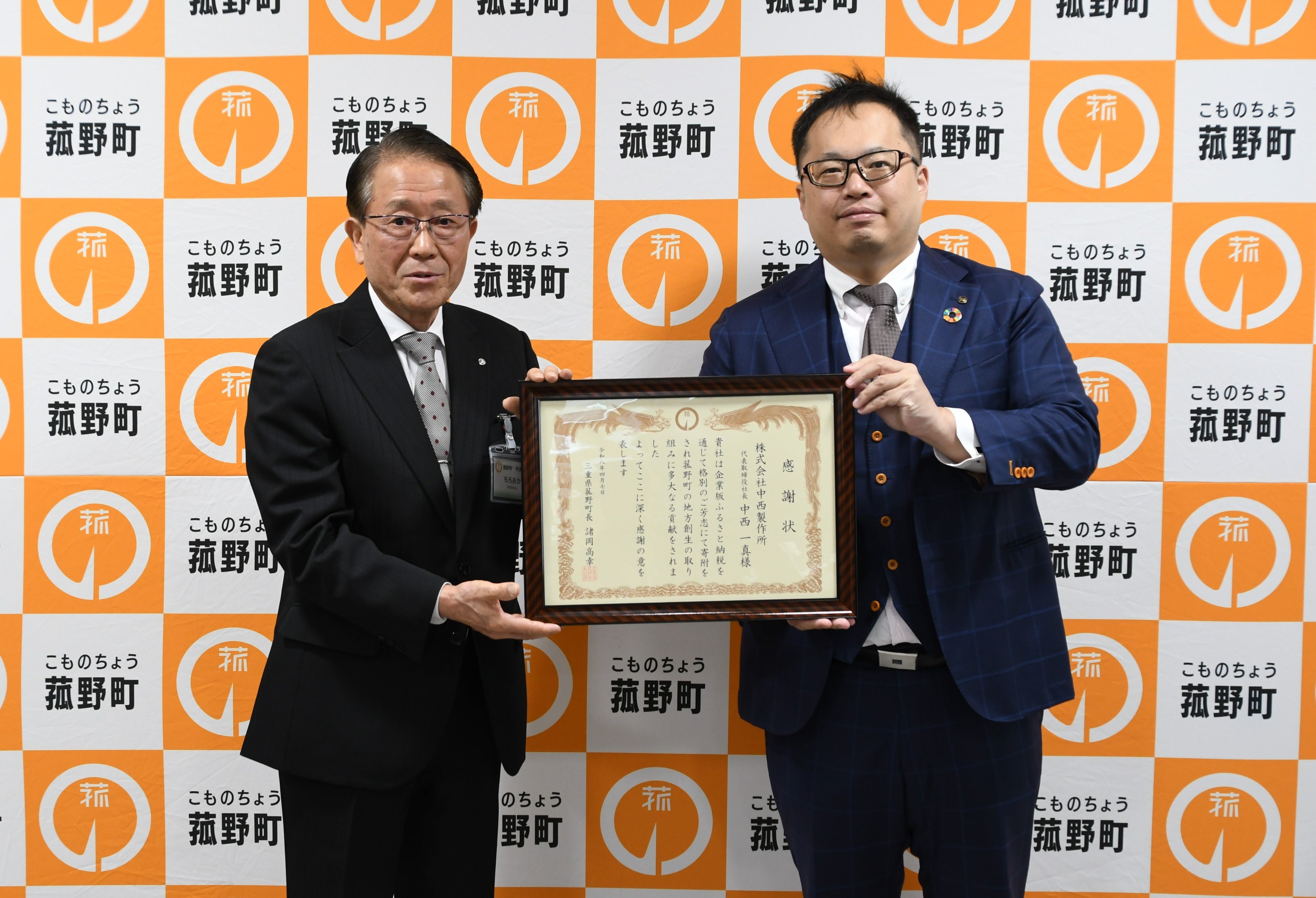 これを受け、令和8年4月7日、菰野町長から株式会社中西製作所の中西一真代表取締役社長へ感謝状を贈呈しました。