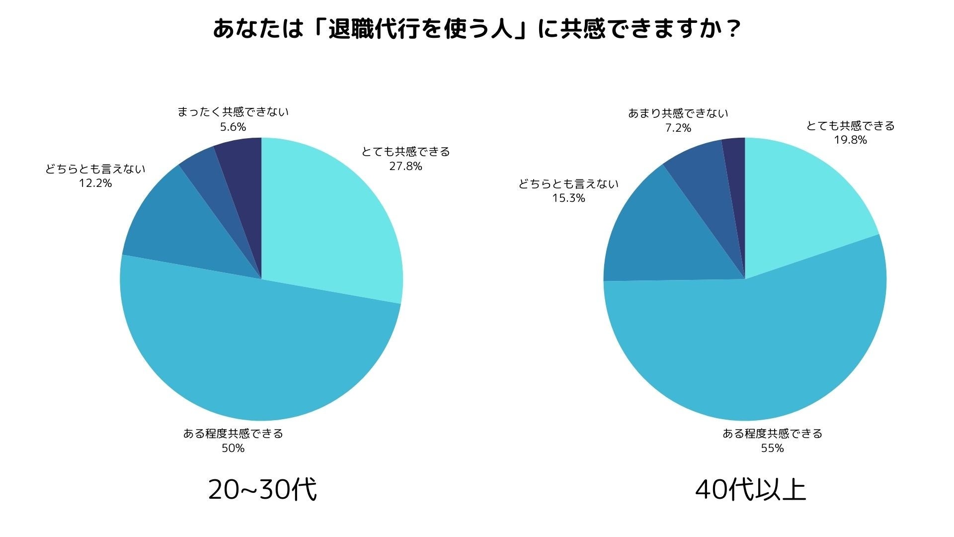 「退職代行を使う人に共感できますか?」という問いに対し、20〜30代の若年層では「とても共感できる」「ある程度共感できる」と回答した人が70%以上を占めました。