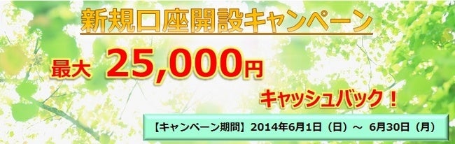 SBI FXトレードが提供する外国為替証拠金取引「SBI FXTRADE」は、2014年6月1日(日)より、最大25,000円の新規口座開設キャッシュバックキャンペーンを実施いたしますのでお知らせいたします。