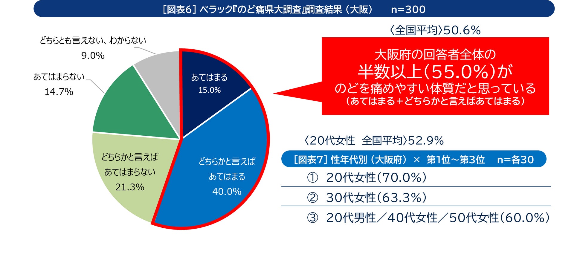 3位となったのは「大阪府」で、大阪府の回答者全体の55.0%が「のどを痛めやすい体質だと思う」「どちらかと言えばのどを痛めやすい体質だと思う」と回答しました【図表6】。また、大阪府の20代女性に関しては、70.0%が「あてはまる」「どちらかといえばあてはまる」と回答しました【図表7】。