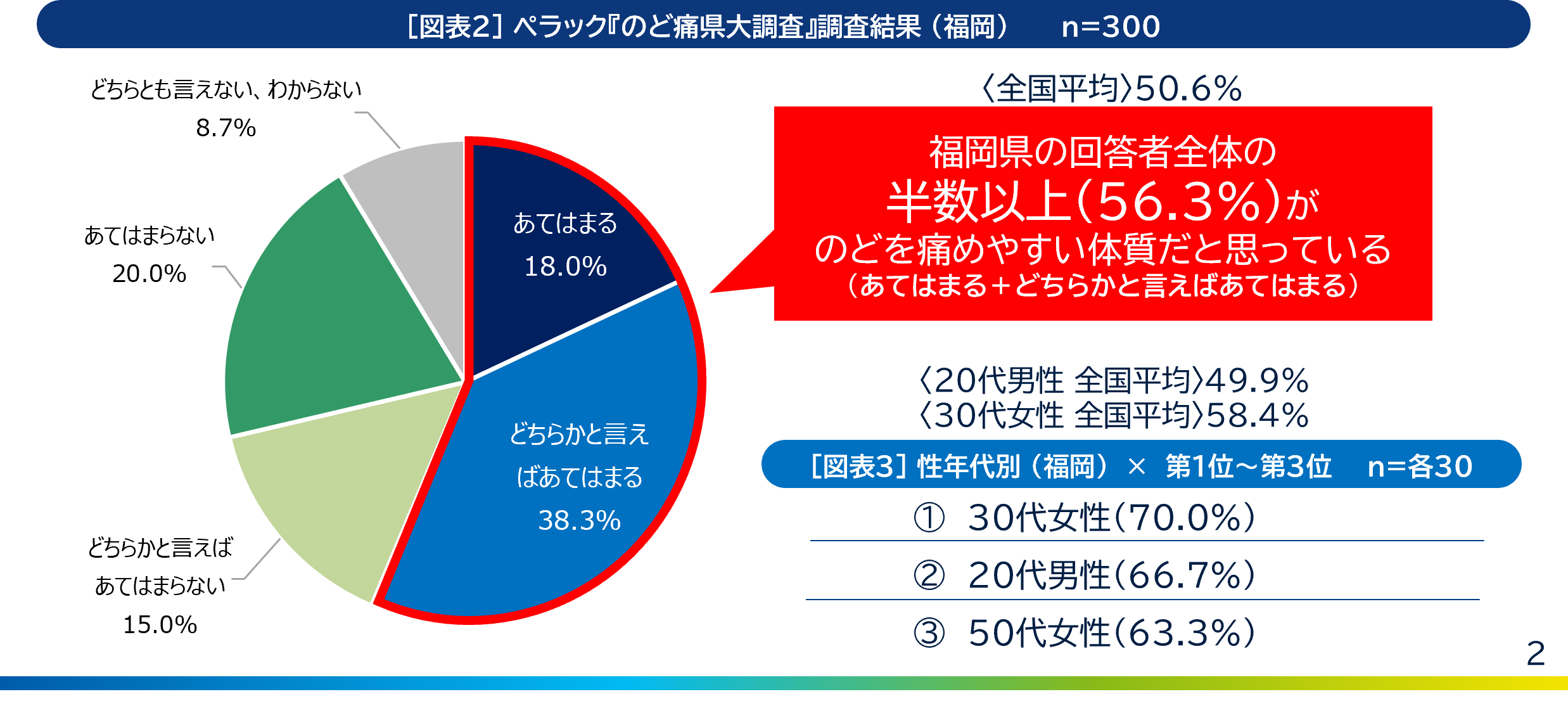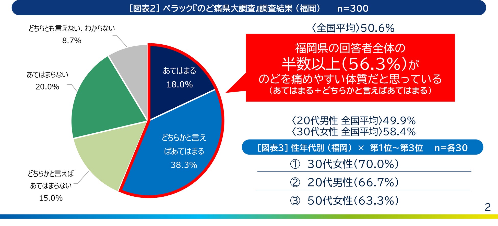 ランキングで1位となった「福岡県」 では、福岡県の回答者全体の半数以上(56.3%)が、 「のどを痛めやすい体質だとう人」となりました【図表2】。性年代別でみると、福岡県の20代男性と30代女性に関しては、「のどを痛めやすい体質だと思うか」という質問に対し、 3人に2人が「あてはまる」「どちらかと言えばあてはまる」と回答しています【図表3】。