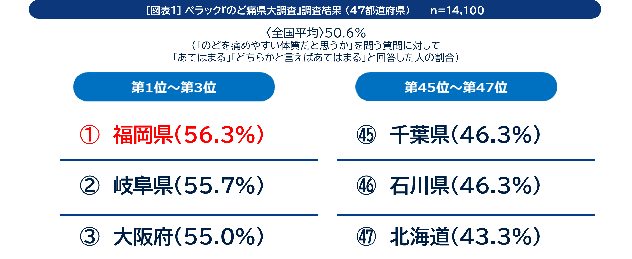 全体の調査結果としては、「福岡県」の半数以上である56.3%が「のどを痛めやすい体質だと思っている人」となり、ペラック『のど痛県大調査』で全国1位となりました。一方、「のどを痛めやすい体質だと思っている人」が最も少なかった都道府県は「北海道」(43.3%)でした【図表1】。
