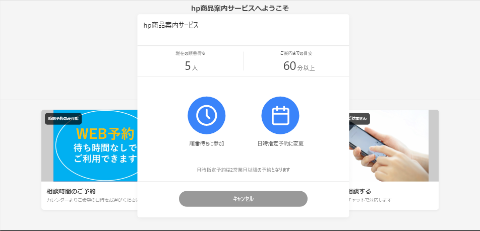 お得なキャンペーン実施時など相談が集中した場合でも、順番待ち機能により対応スタッフ数を超える受付が可能となりました。順番待ちに申し込んで頂くことで、お申し込み時に登録いただいた携帯番号かメールアドレスに順番になったら通知を発信。待ち時間を自由に過ごして頂くことが可能です。