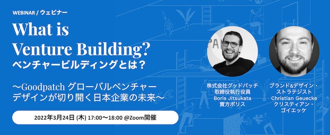 本発表にともない、Goodpatch グローバルベンチャーデザイン事業責任者の實方ボリスによるオンライン説明会を実施します。ベンチャービルディングのコンセプト、グッドパッチの取り組み、そして日本企業の海外展開における新たなアプローチの重要性についてご紹介する予定です。ご関心ある方は下記よりご登録をお願いします。