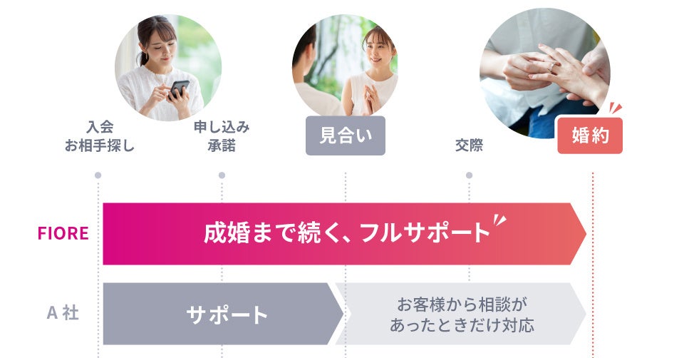 当たり前に思うかもしれませんが、結婚相談所によっては、「お見合い」でお相手と出会えた段階や、「交際」でパートナーが見つかった段階でサポートがなくなるところもあります。フィオーレでは婚約・結婚に至るまで、フルサポートを受けられます。会員様も婚約までを真剣に考えている方が多いことも特徴です。