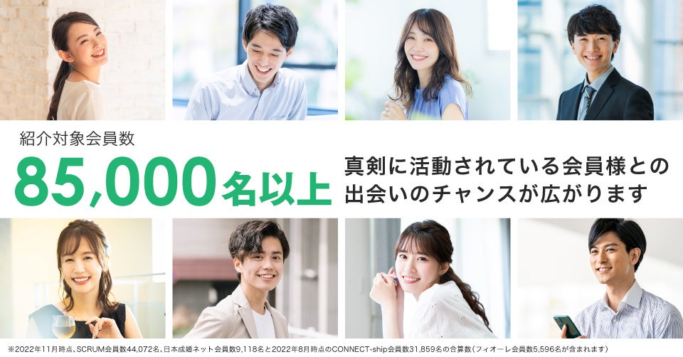 ※2022年11月時点、SCRUM会員数44,072名、日本成婚ネット会員数9,118名と2022年8月時点のCONNECT-ship会員数31,859名の合算数(フィオーレ会員数5,596名が含まれます)
