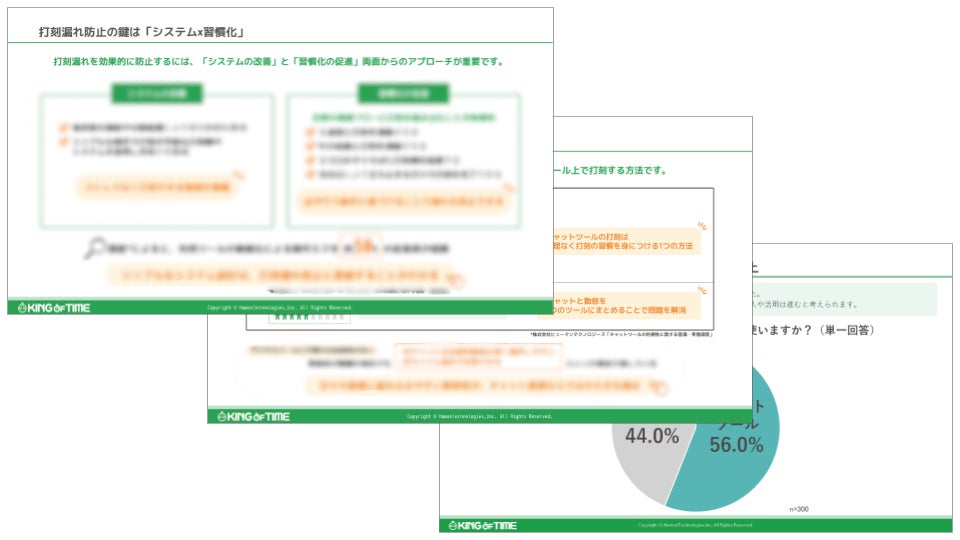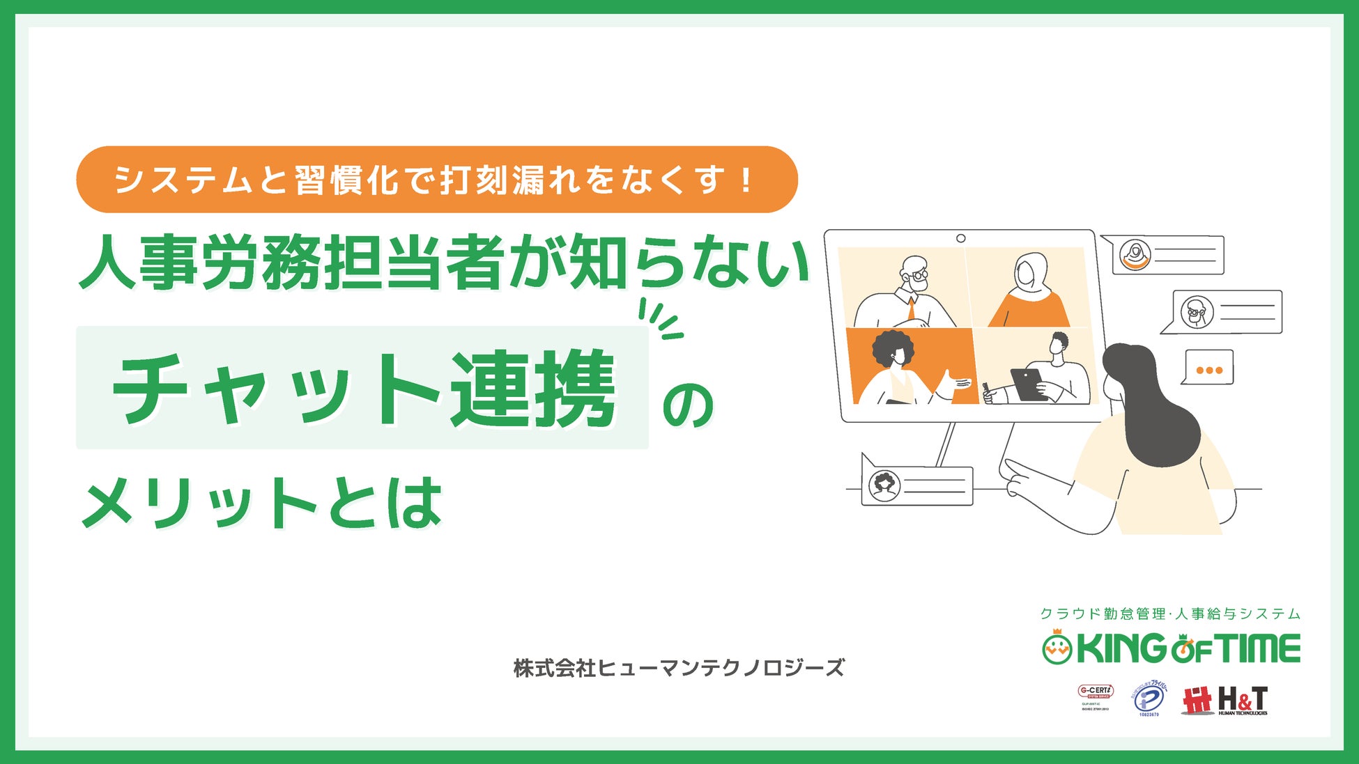 株式会社ヒューマンテクノロジーズ(本社:東京都港区、代表取締役社長:家﨑 晃一)は、多くの企業が課題とする「打刻漏れ」の解決策を提案するホワイトペーパー「システムと習慣化で打刻漏れをなくす!人事労務担当者が知らないチャット連携のメリットとは」を公開いたしました。本資料では、打刻漏れが発生する原因の分析から、多様な働き方に対応した具体的な防止策まで、人事労務担当者が知っておくべき情報を解説しています。また、チャットツールの利便性に関する独自の意識・実態調査結果も併せて公開し、現代の働き方に合わせた勤怠管理のあり方を提案しています。