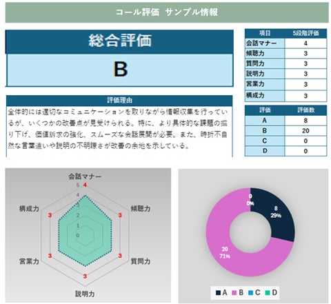 本システムでは、各通話に対し、「総合評価」および「主要6項目(会話マナー、傾聴力、質問力、説明力、営業力、構成力)」に基づいた詳細な評価を行い、各評価基準(A, B, C, D)と、その判断根拠を自動で出力します。