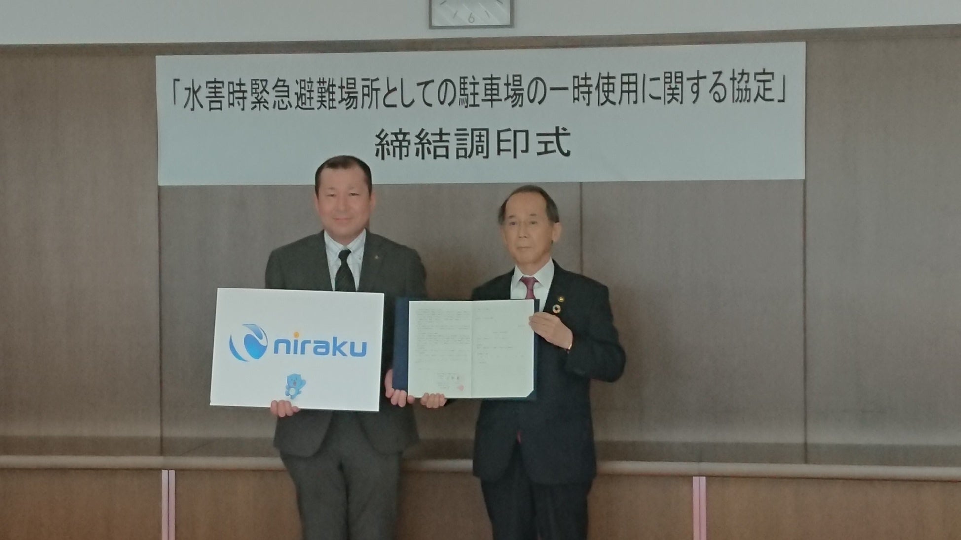 株式会社ニラク(本社:福島県郡山市方八町二丁目1番24号 代表取締役社長 谷口久徳)は、2022年2月22日(火)に、ニラク海老名本郷店と海老名市との間で「水害時緊急避難場所としての駐車場の一時使用に関する協定」を締結しました。