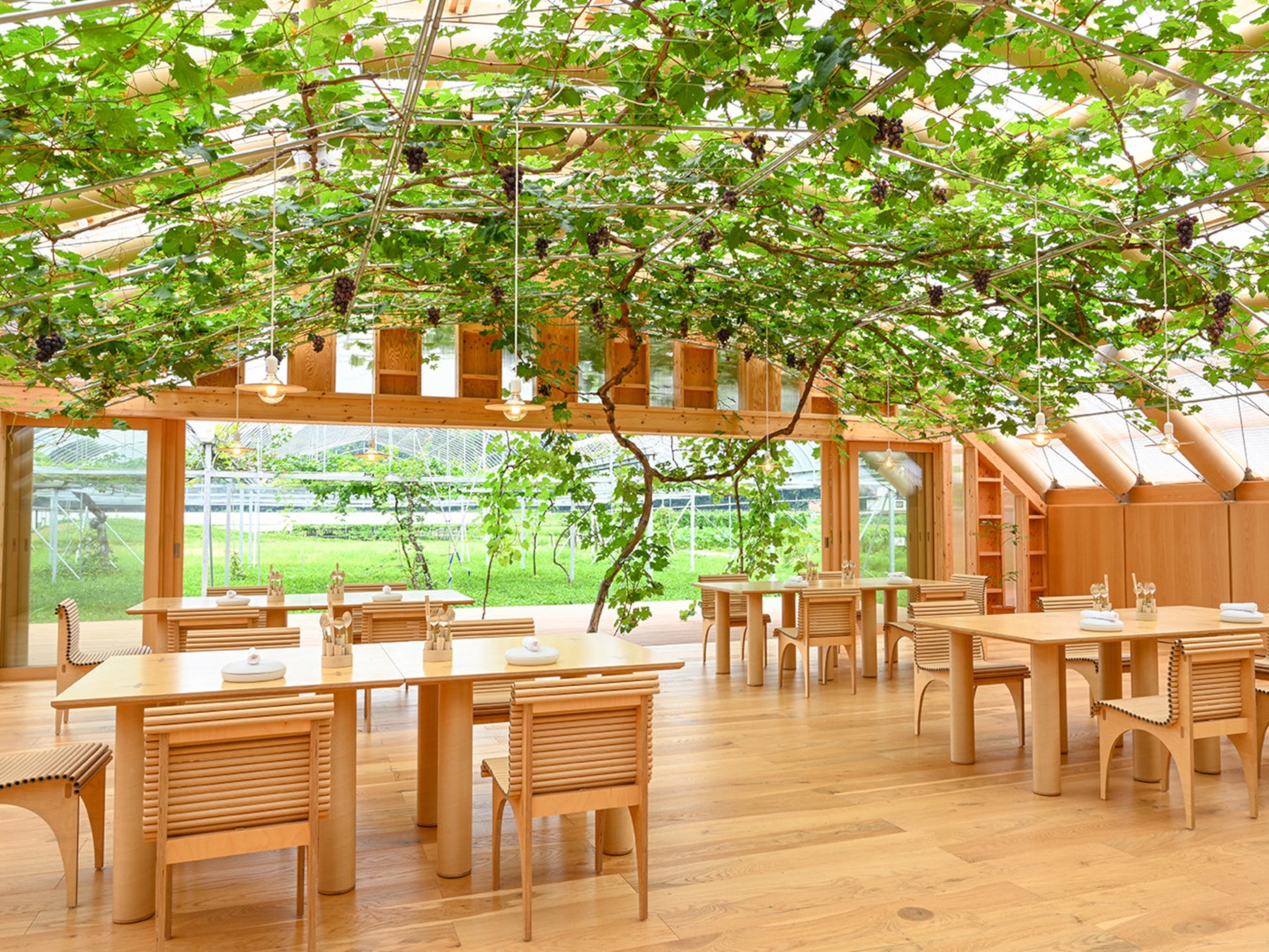 金沢市岩出町に広がる一面の葡萄園、その中に「レストランぶどうの森 レ・トネル」はあります。日本を代表する建築家・坂茂氏の設計によるレストランは、独創性と持続可能性が共存し、自然との調和を大切にした美しい空間。