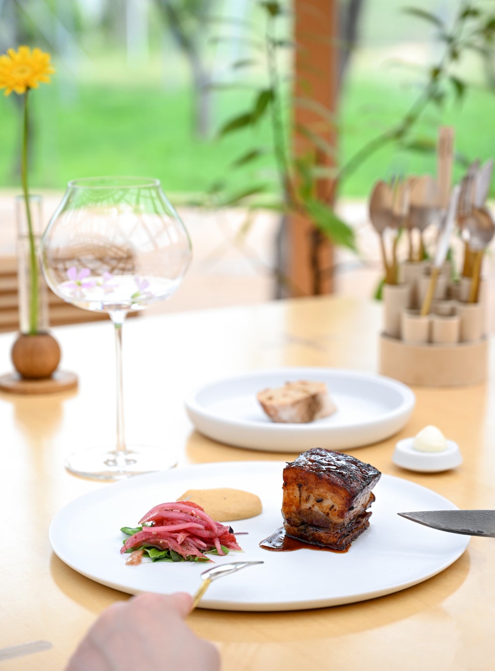 ・氷見牛の薪焼き、紅くるり大根の粘土焼き、しいたけとエシャロットのピクルス、赤ワインと数種の洋酒・クロモジのソース