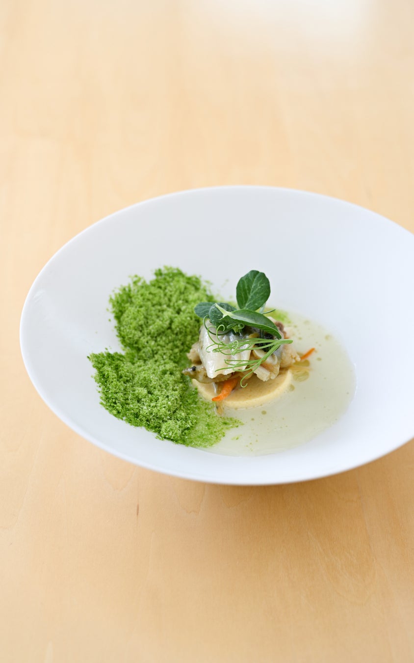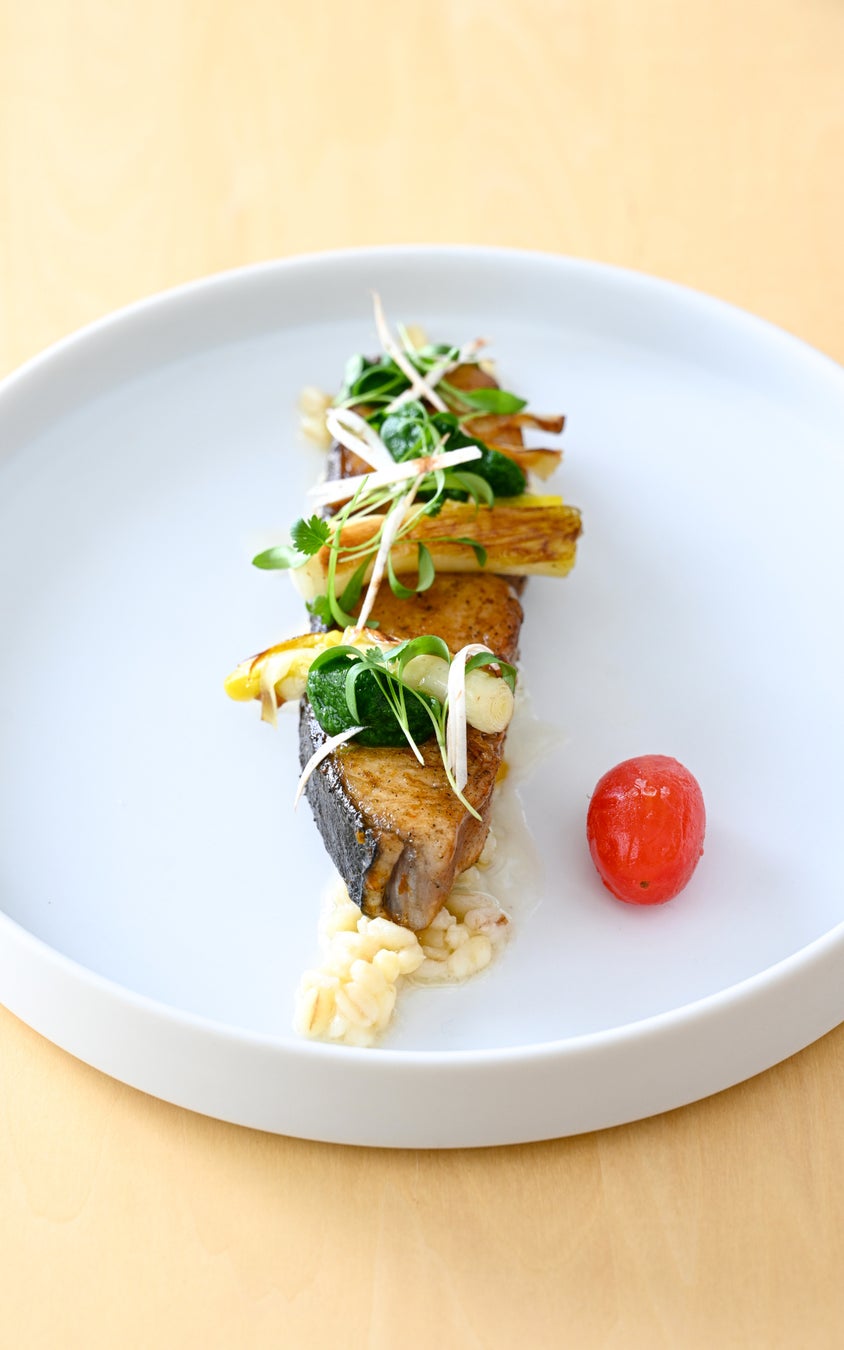 ・石川県七尾産鰆のサランデアード(メキシコの郷土料理。特製のマリネ液に漬け込み、炭火でじっくりと焼き上げる)、自社農園で育てたポロネギ、ブルグルのリゾット-(e)