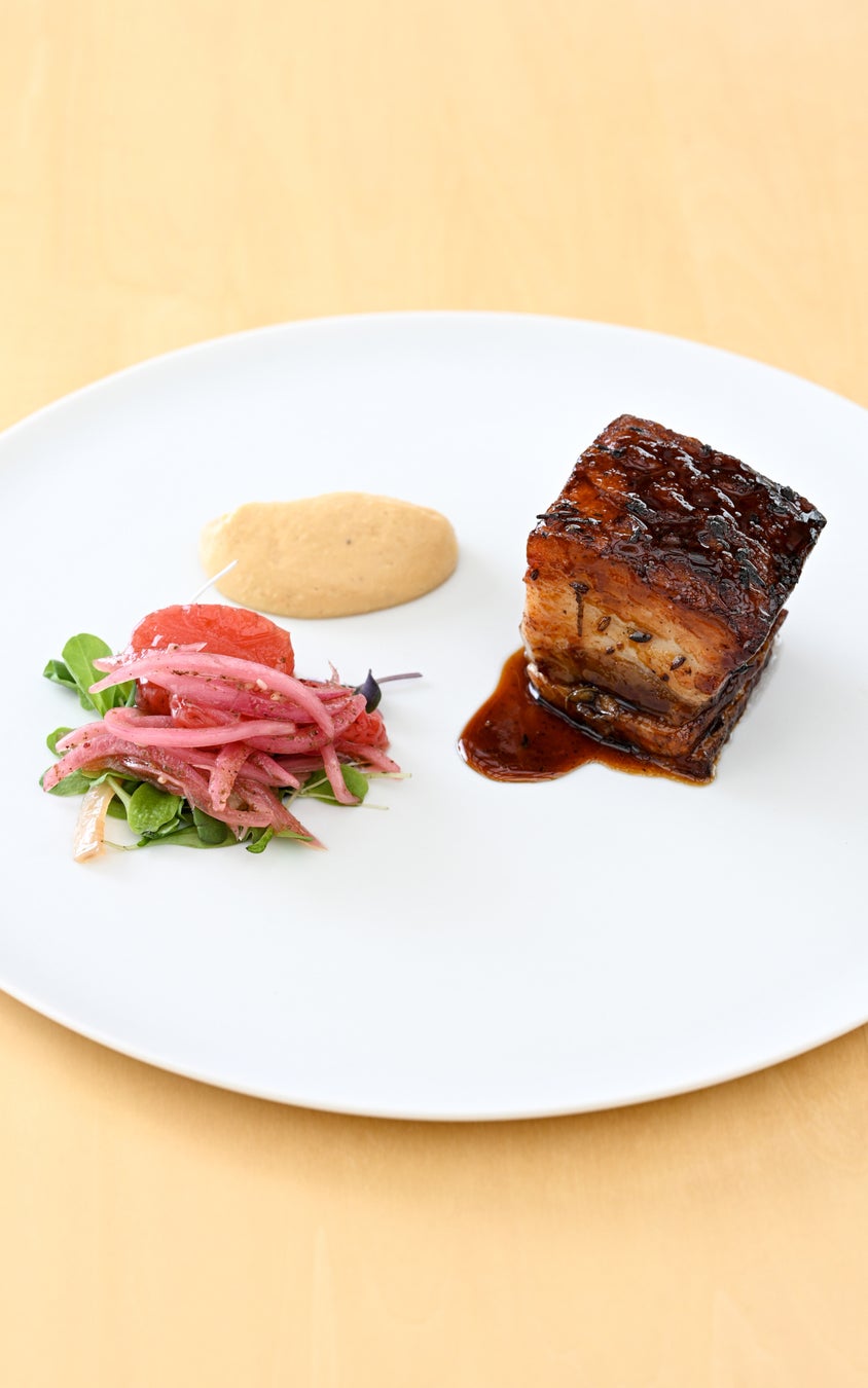・富山県産タカハタポークのグラッセ、自社農園で育てたいちごのピクルス、ひよこ豆と胡麻のフムス-(d)