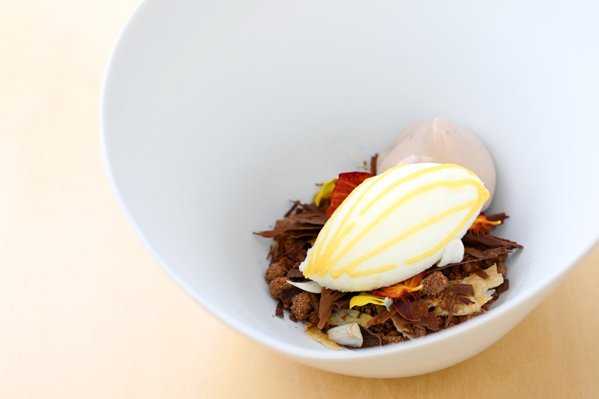 ・蜜柑の花のソルベ、チョコレートのクランブルと赤ワインのジュレ-(g)