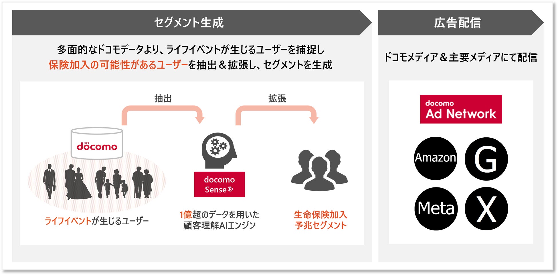 今回提供を開始した「保険加入予兆ターゲティング」は、1億超(※1)のドコモユーザーから保険に加入する可能性が高いユーザーを抽出してセグメント化し、広告配信に活用できるソリューションです。ドコモが保有する契約者情報やアプリインストールログ、アンケートデータ等の膨大なデータをもとに、ドコモの独自AIエンジン「docomo Sense®」の拡張機能を活用することで、就職や結婚、出産、住宅購入、定年退職など様々なライフイベントを予測し、保険に加入する可能性が高いタイミングを捉え、セグメントを作成します。このソリューションにより、生命保険や医療保険など各種保険に加入する可能性が高いと予測できるユーザーに対して広告配信を行うことで、効率かつ効果的に良質なリードを獲得することを目指します。
